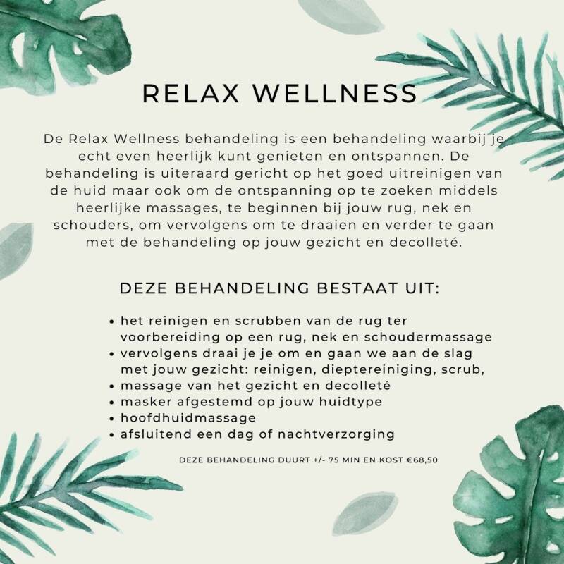 ♡ de Relax Wellness treatment: de naam zegt het al, een echte relaxte behandeling waar je helemaal ontspannen van wordt inclusief rug/nek/schouder massage. (uiteraard worden eventuele onzuiverheden ook gereinigd)